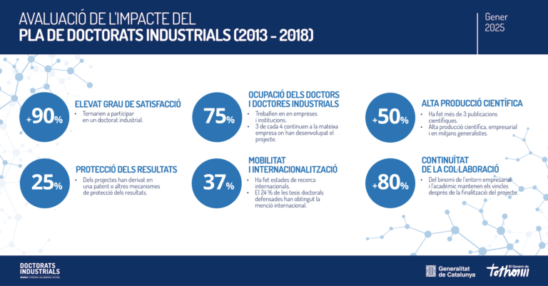 A inicis del 2025 es van publicar els resultats de l’avaluació del Pla de Doctorats Industrials (2013-2018), posant de manifest l’elevada taxa de satisfacció entre els agents participants, així com un alt percentatge d’inserció laboral i un índex molt rellevant de producció científica i de patents.